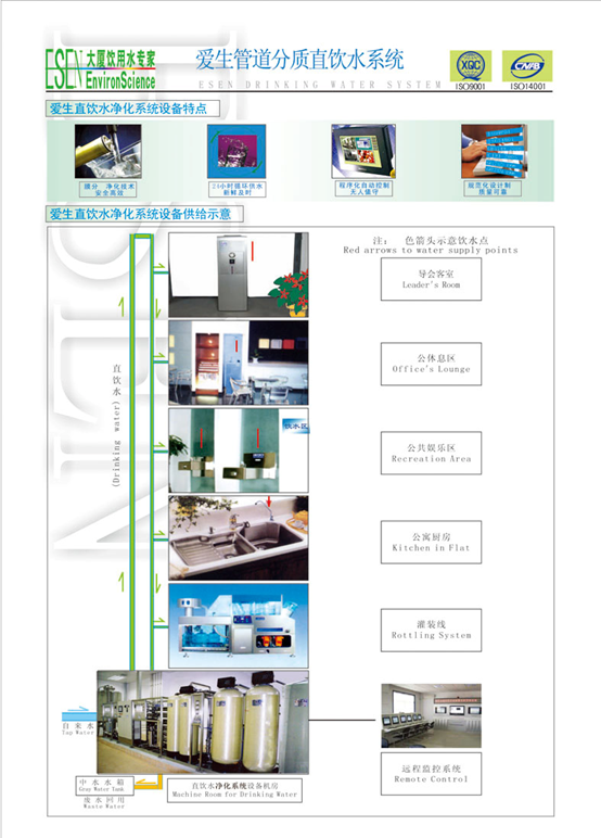 愛生直飲水系統(tǒng)是由原水箱、增壓單元、預(yù)處理單元、膜主機(jī)單元、循環(huán)供水單元、消毒單元、自動控制單元、專用管網(wǎng)、專用水表、各式飲水終端等組成。